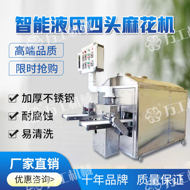 智能液壓四頭麻花機,操作簡單,采用三調速結構,生產時將和好的面團放入機器內,在靜壓推面器的作用下經模具出條后,通過模具的旋轉自動上勁挽花,再由延時切段機自由控制麻花的長短,產品花形美觀漂亮,高效節能、安全衛生、無噪音無污染,極大的提供高了生產效率和產品質量。