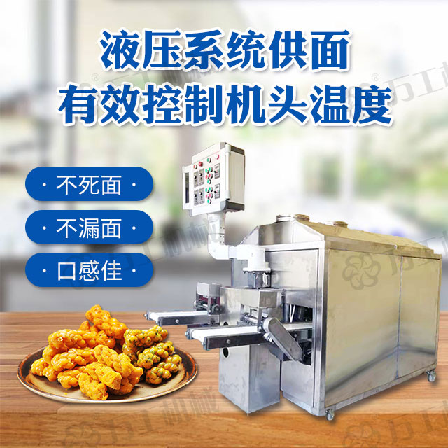 ①自動化系統。采用自動化技術:機械、液壓、電器、電子綜合自動化控制技術,最大限度地節省了人力。油缸進退、壓面速度、扭股成條、麻花長短控制(截條)、成品堆放收集,都實現了自動化。整個機器只需要一人即可操作。